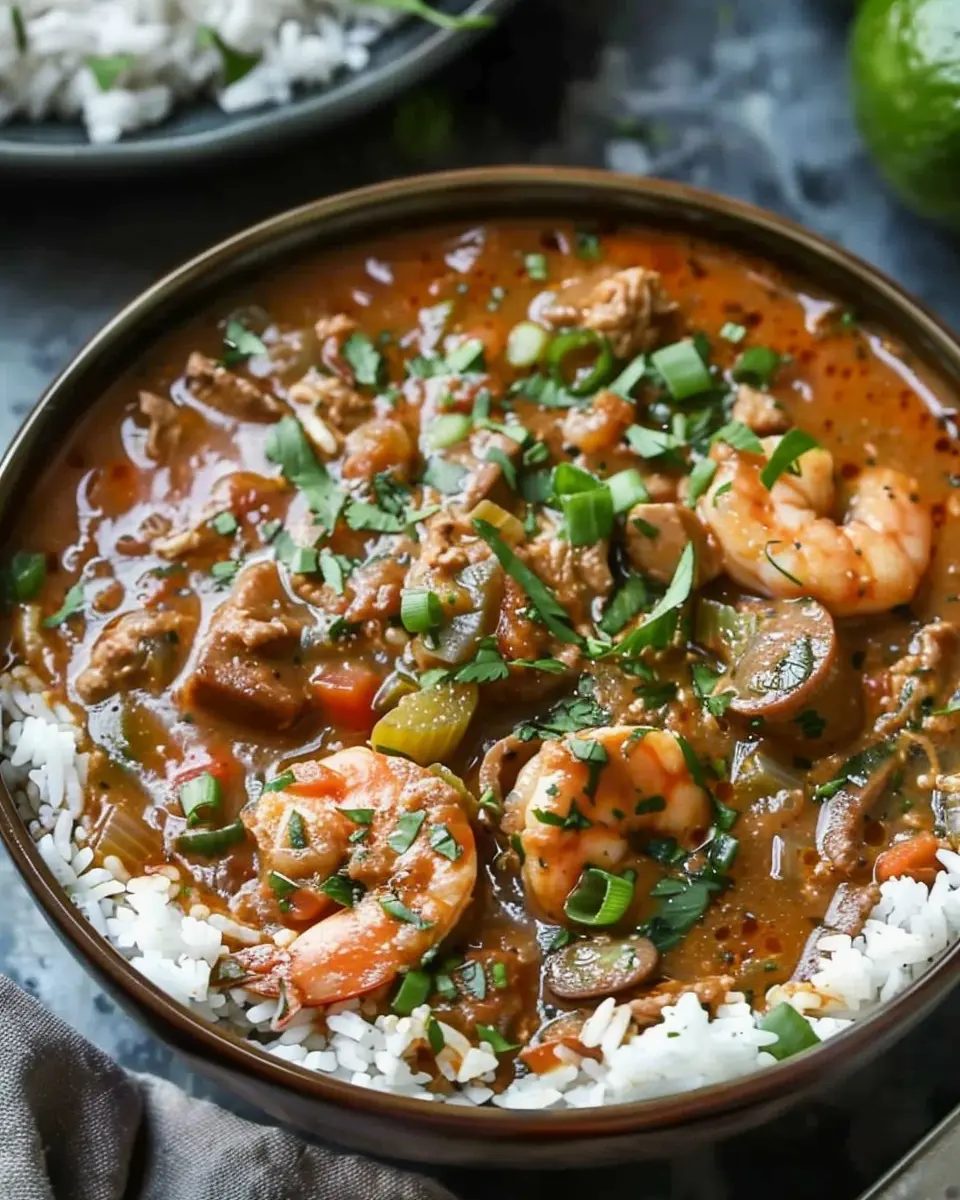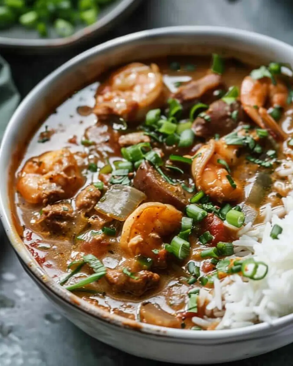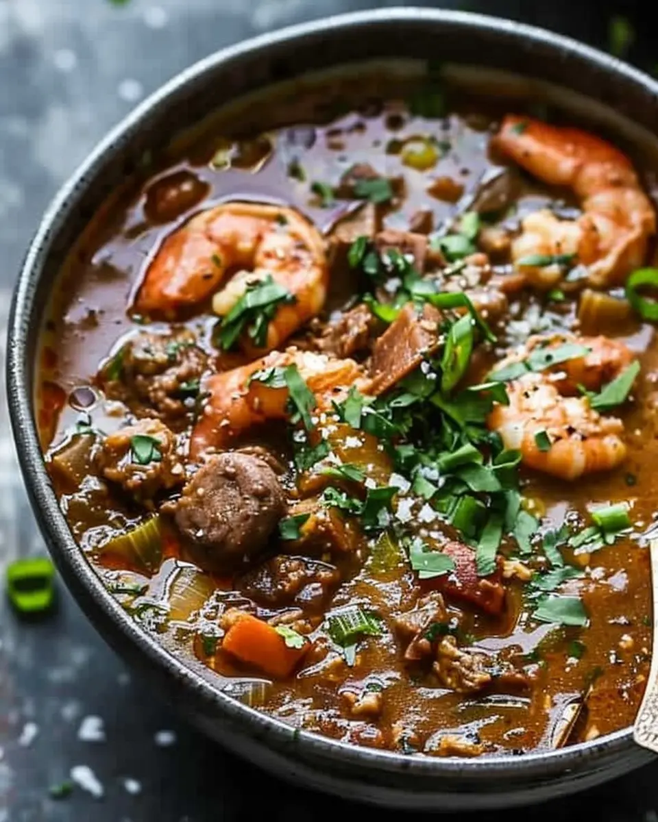 A rich and flavorful gumbo featuring turkey bacon and chicken ham, capturing the essence of New Orleans cuisine.