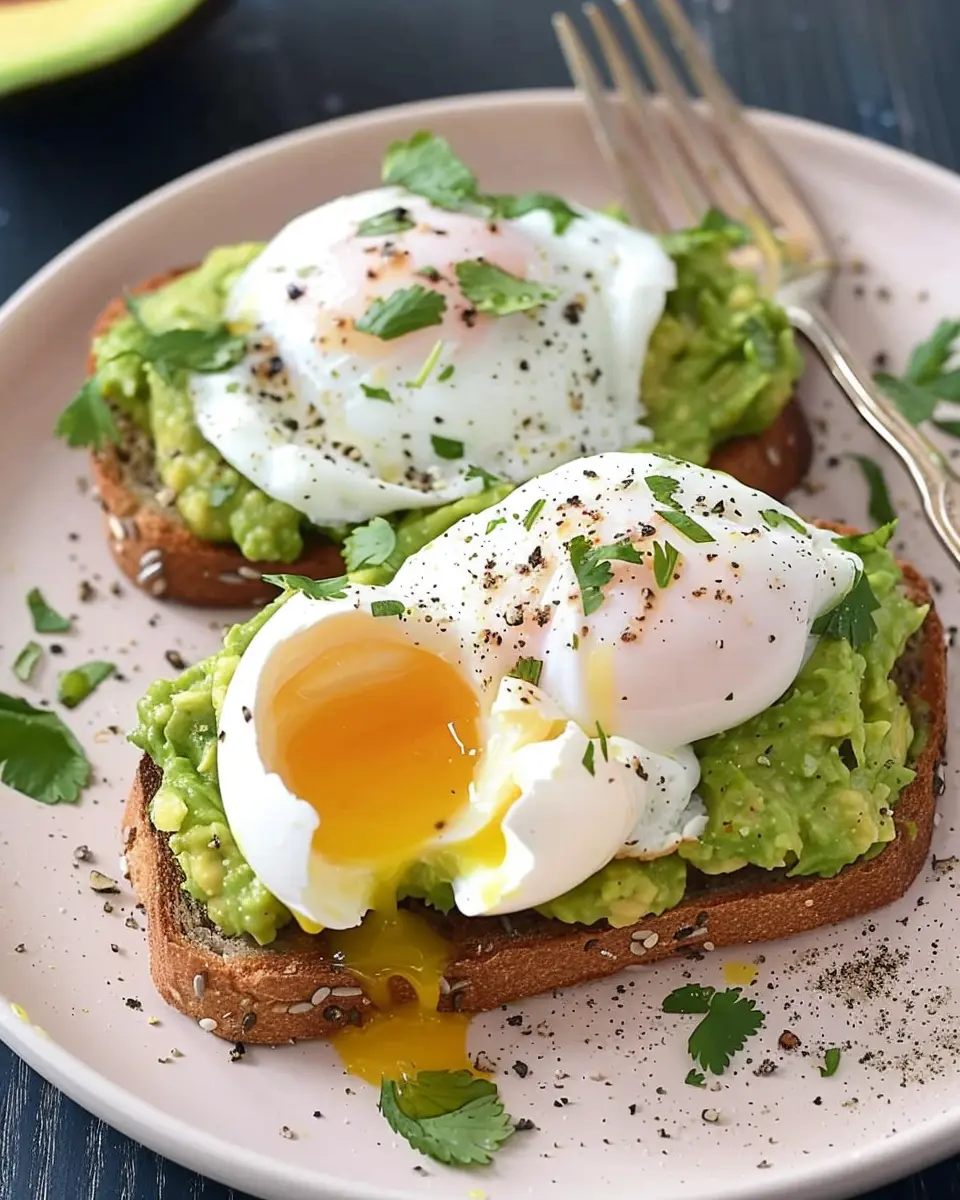 A delicious and simple breakfast recipe featuring creamy avocado and perfectly poached eggs on toasted bread.