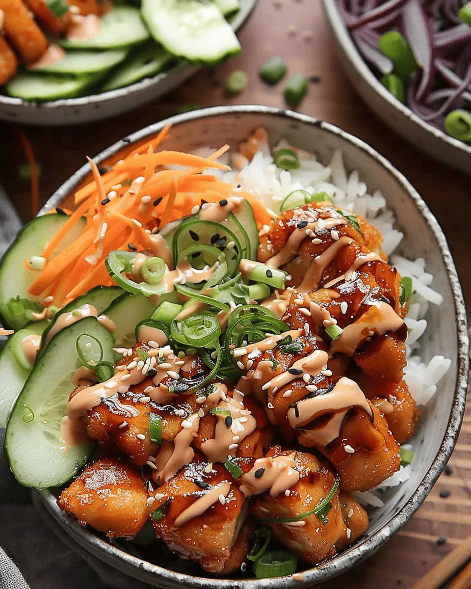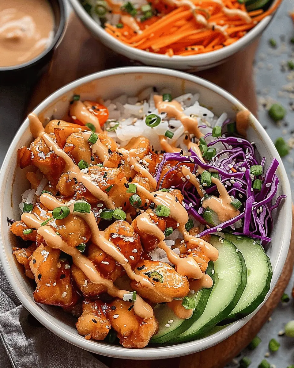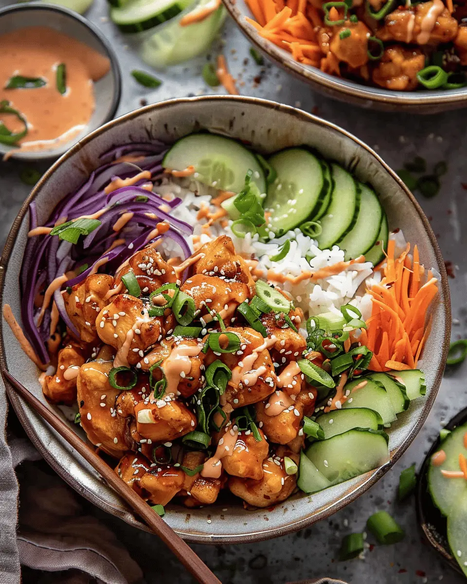 Now comes the fun part—assembling your delicious Bang Bang Chicken Bowl! Feel free to get creative with your toppings.