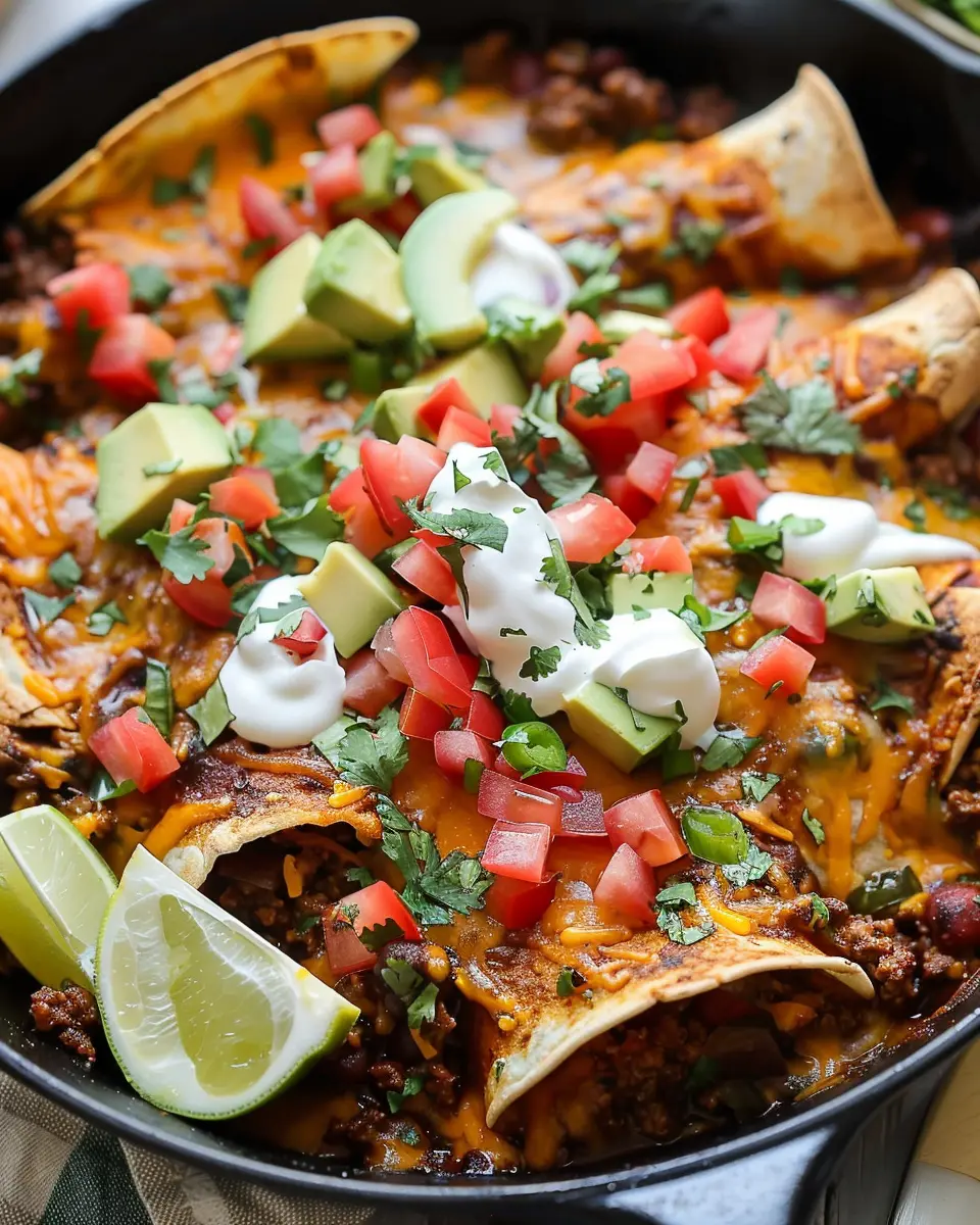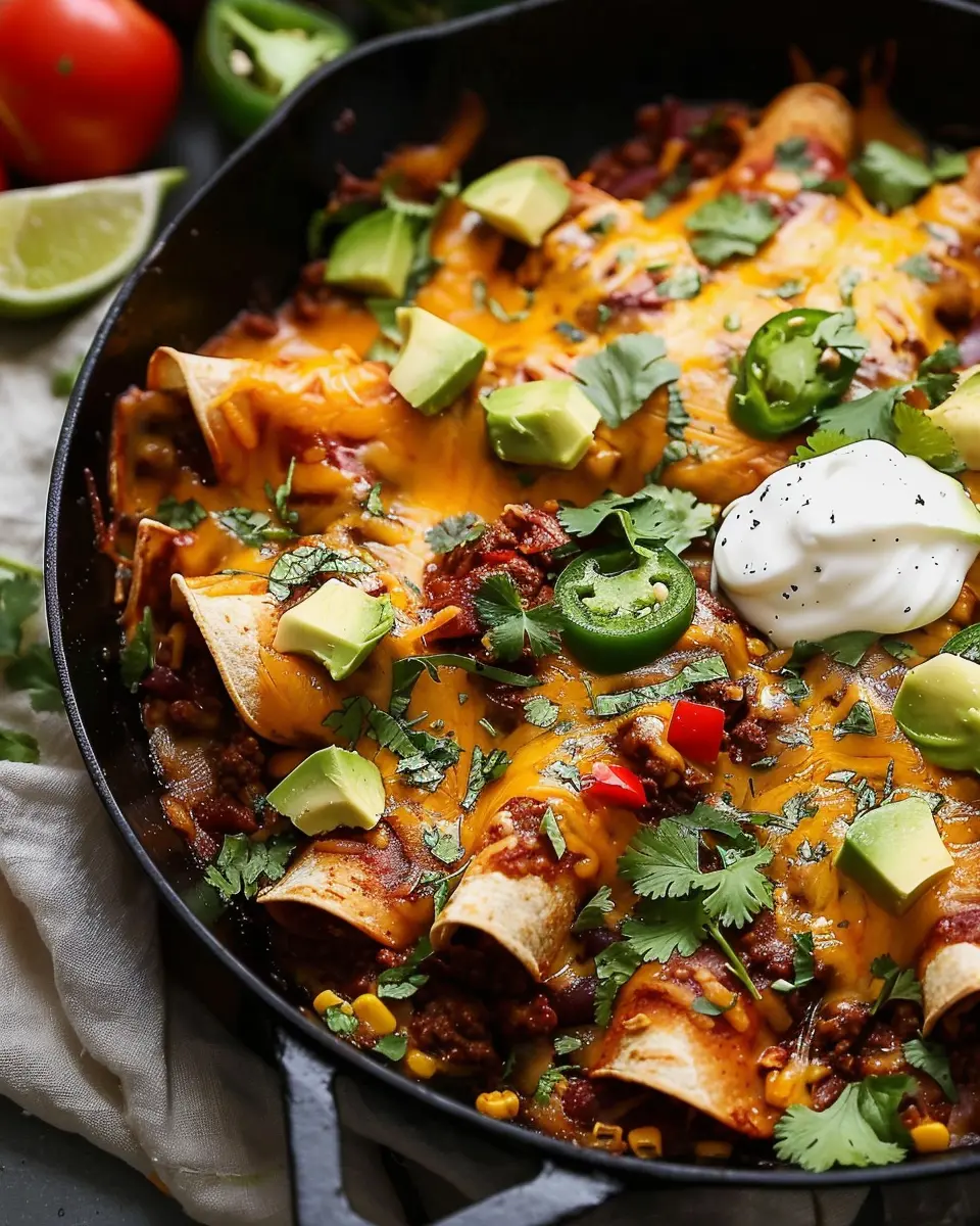 Elevate your Beef Skillet Enchiladas with a few simple yet eye-catching garnishes. Fresh cilantro adds a bright pop of color and a burst of flavor. You could also try crumbling some feta or cotija cheese on top for a salty contrast that really complements the beef. A drizzle of creamy avocado lime dressing can bring the dish together—it’s refreshing and adds a lovely creaminess. Don’t forget to squeeze a bit of fresh lime juice over the dish before serving for that zing!