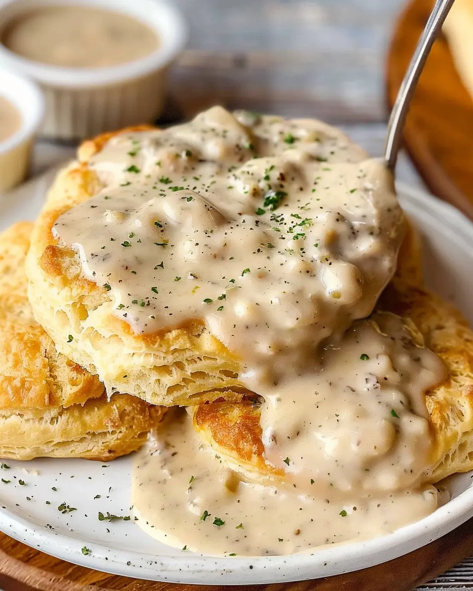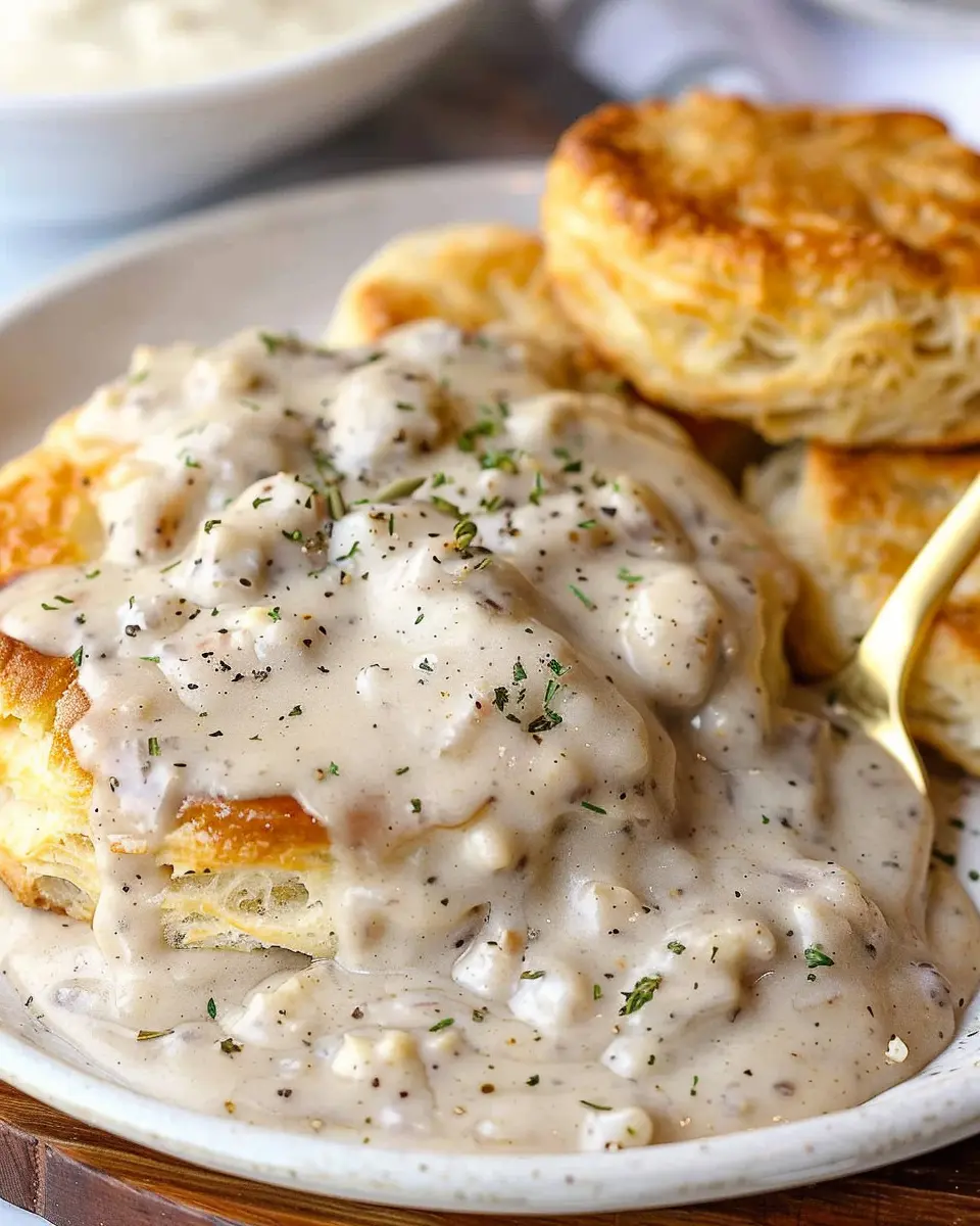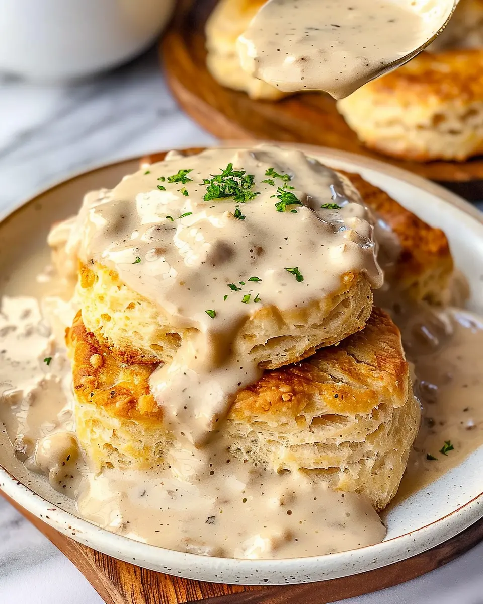You want a creamy, savory gravy that will beautifully coat your biscuits.