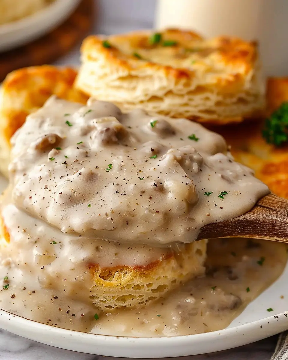 You want a creamy, savory gravy that will beautifully coat your biscuits.