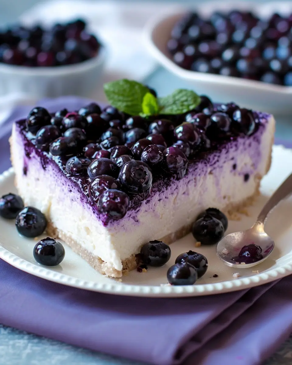 Rich and Creamy: Using a blend of cream cheese, sour cream, and a hint of vanilla, the cheesecake filling is divine. It’s a creamy cloud that melts in your mouth, creating an irresistible base for the blueberry topping.