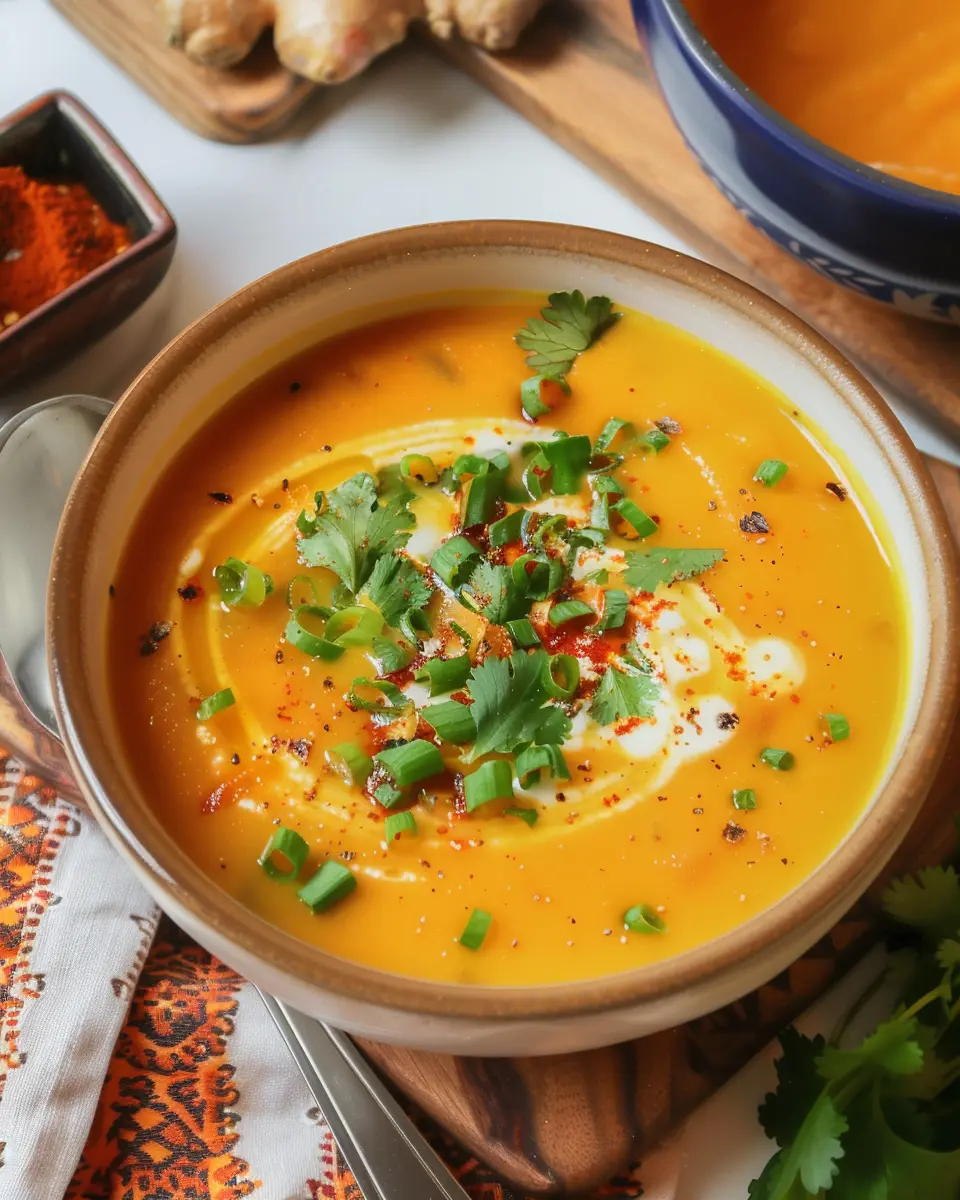 These garnishes not only enhance the taste but also provide a beautiful contrast to the orange hue of the soup.