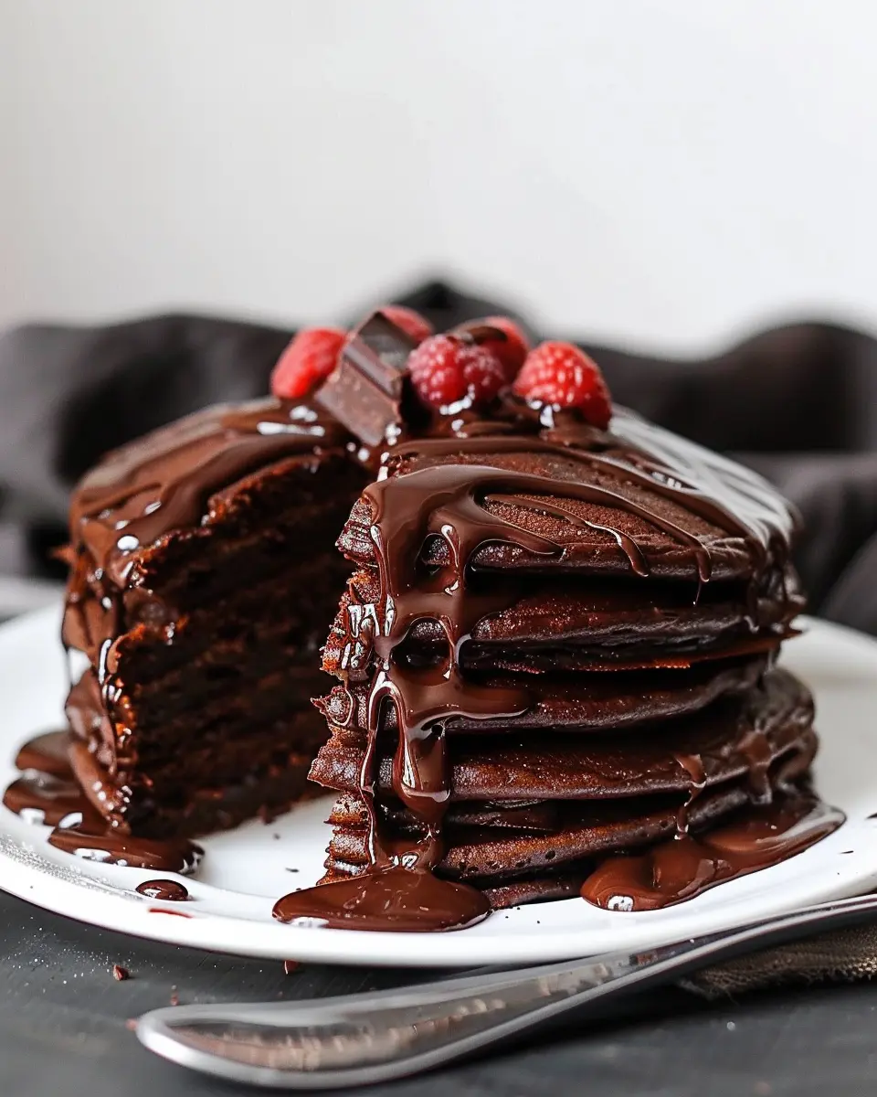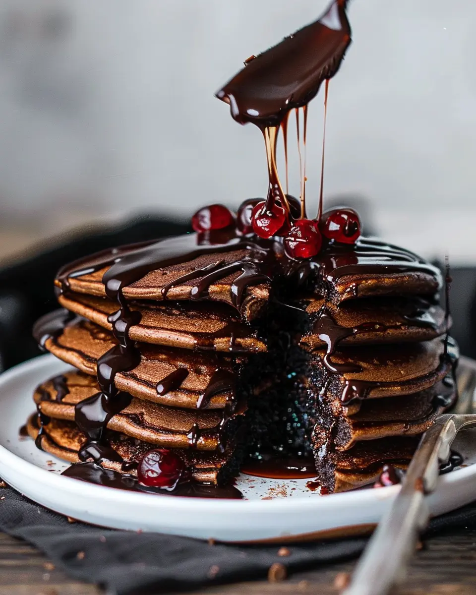 Once flipped, cook for another minute or so until golden brown. You want that crispy edge with a soft center! Repeat this process until all the batter is cooked, then stack those pancakes high. Serve with the chocolate ganache drizzled on top, and if you’re feeling adventurous, consider pairing them with turkey bacon or chicken ham on the side.
