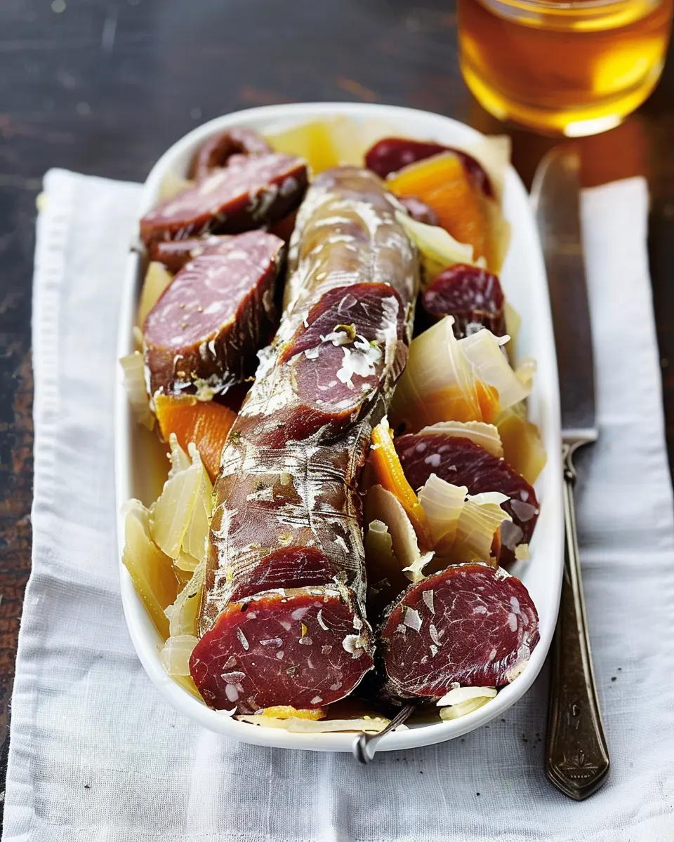 Taste and Adjust: Before serving, taste your dish; you may want to adjust the seasoning to your preference. Once everything is tender and the flavors are harmonious, your chou braisé aux saucisses is ready to be plated.