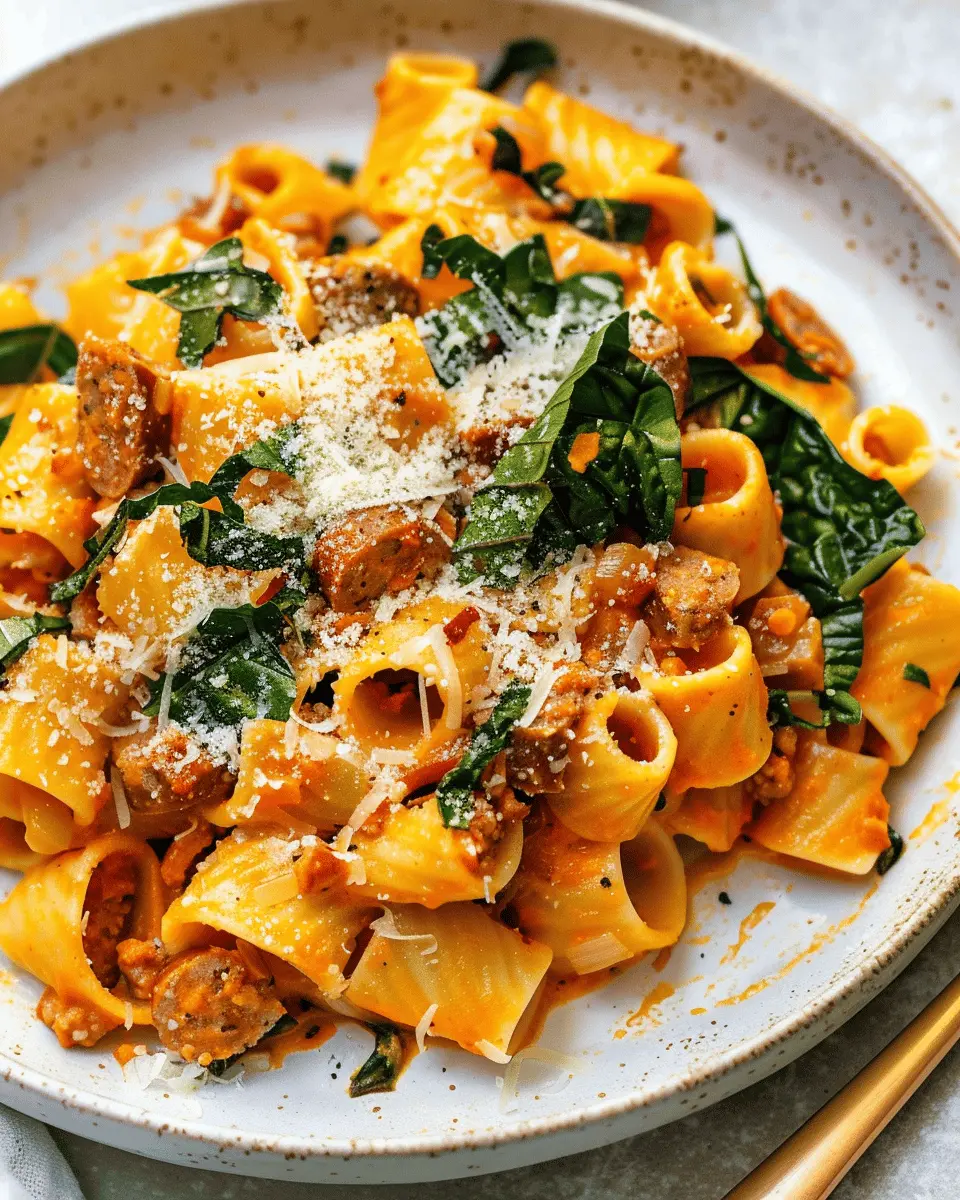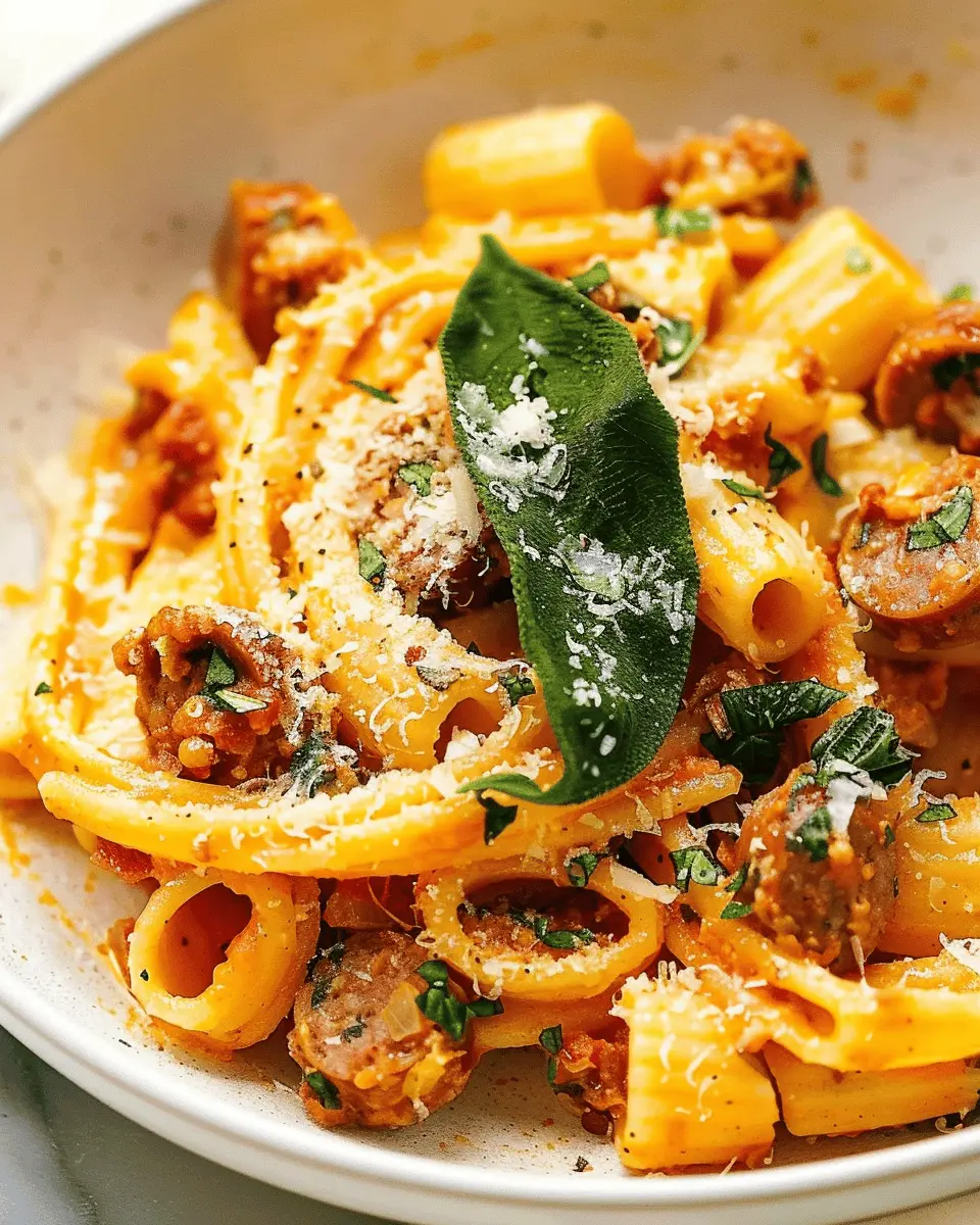 Delve into the comforting flavors of creamy pumpkin pasta paired with savory Italian sausage, perfect for a cozy meal.