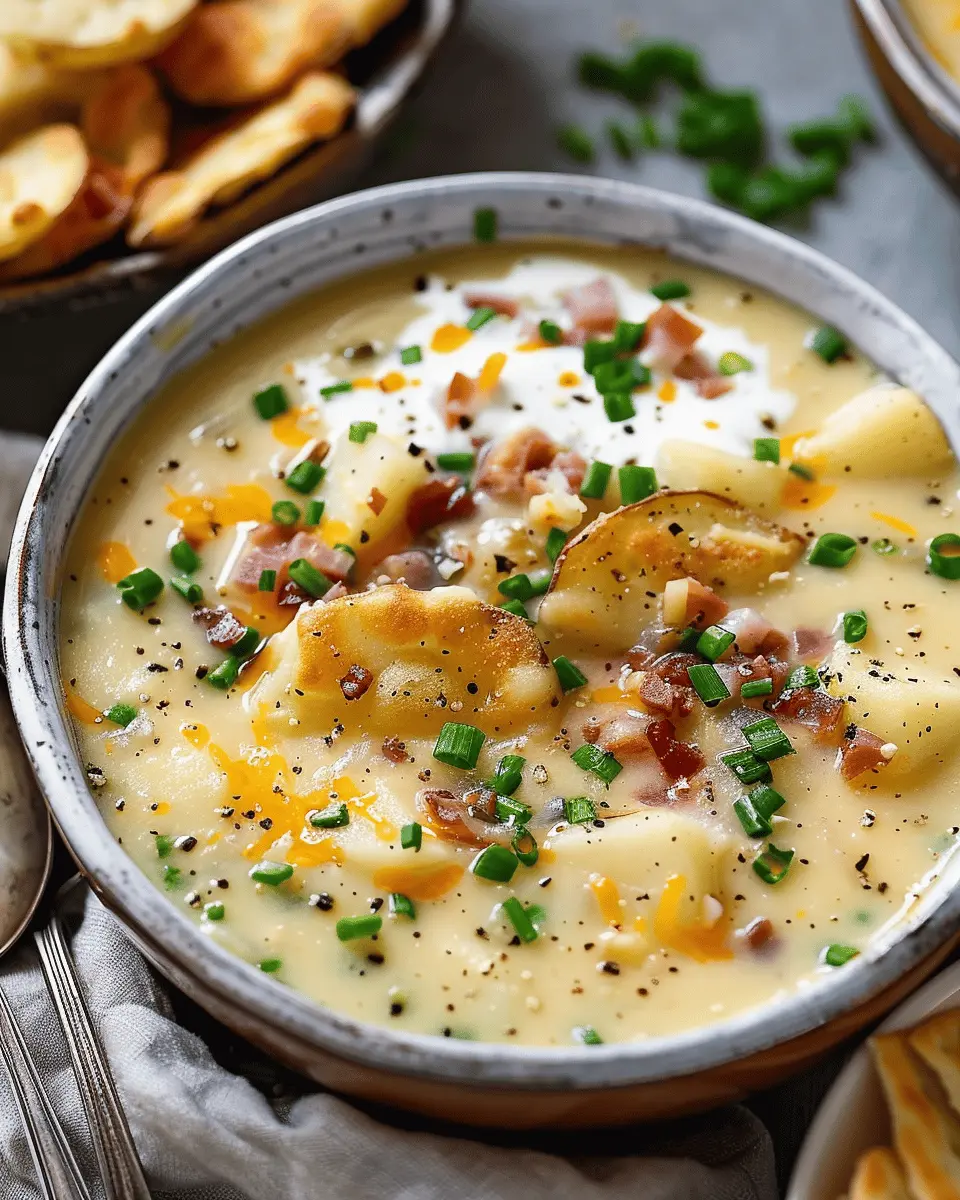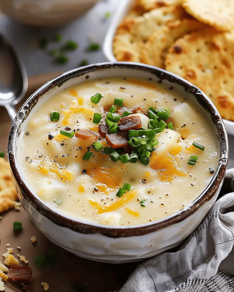 Enjoy a warm and hearty Crockpot Potato Soup featuring turkey bacon and chicken ham, perfect for any meal.