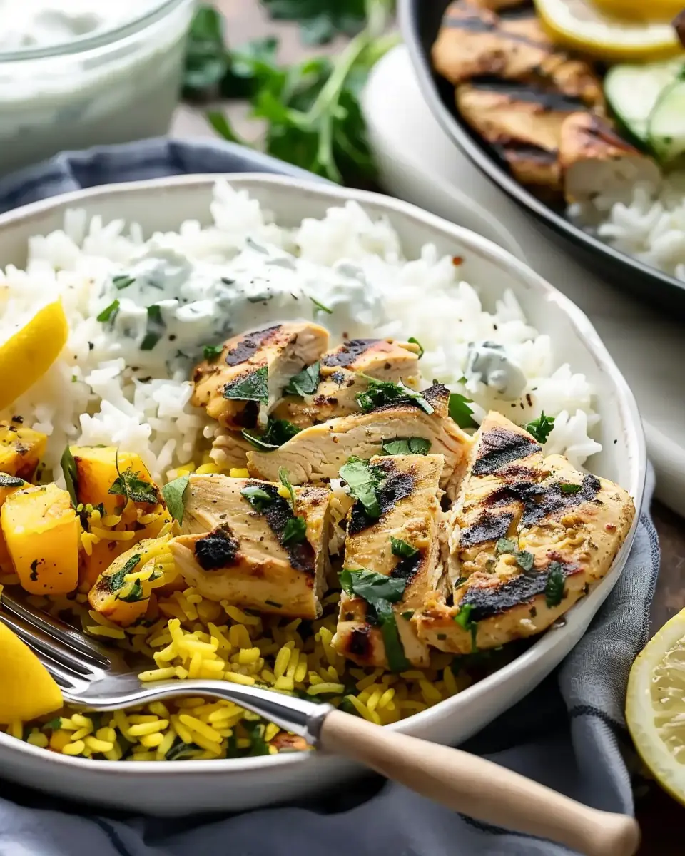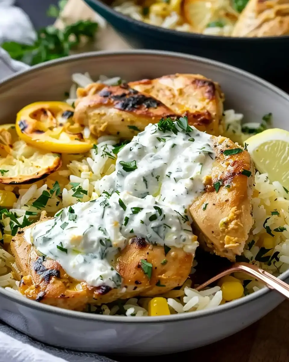Using a fork, gently fluff the rice to separate the grains — they should be perfectly cooked and infused with flavor from the broth and chicken. To serve, drizzle the remaining tzatziki sauce over the chicken. This not only adds a creamy texture but also brightens the entire dish with its refreshing flavor.
