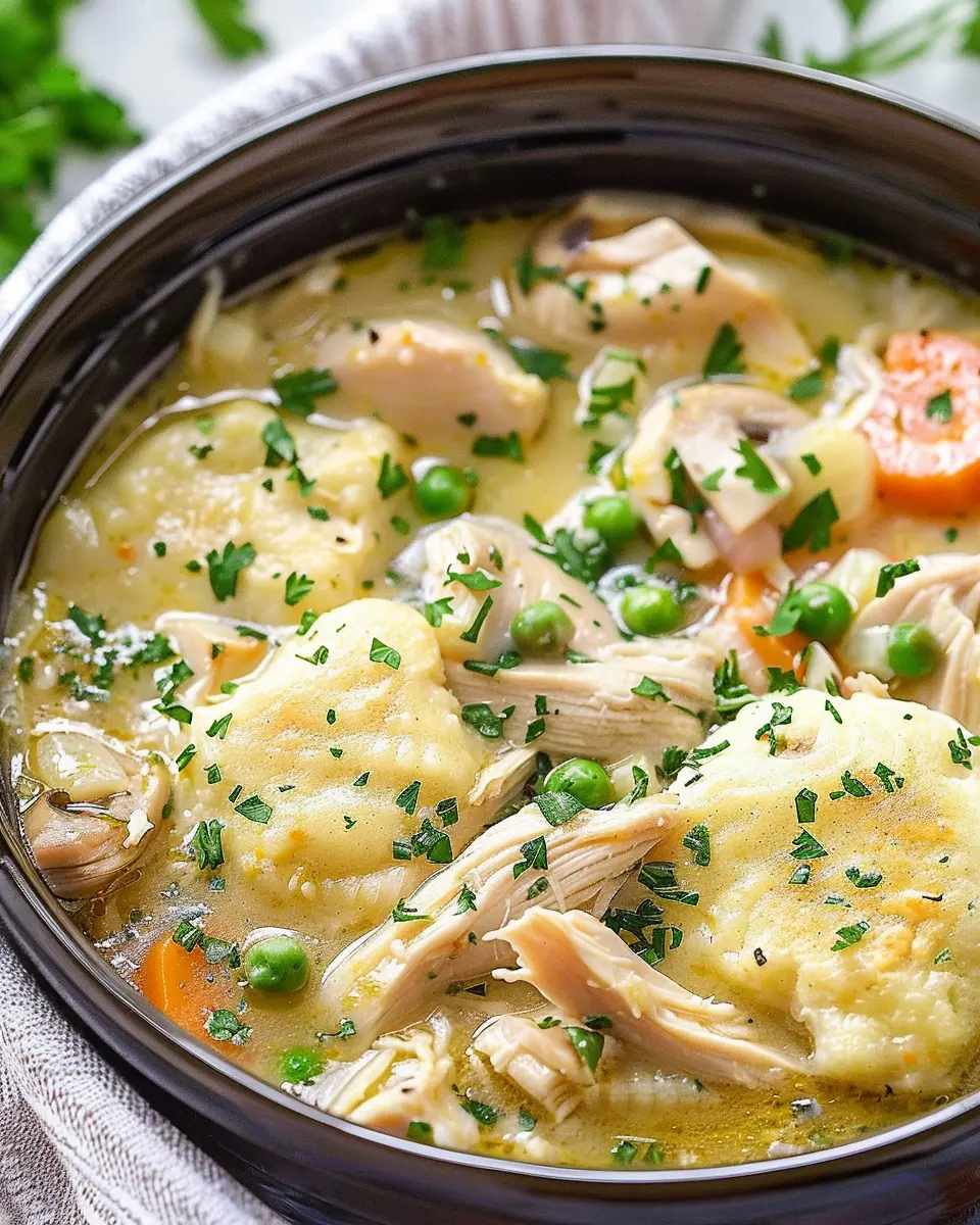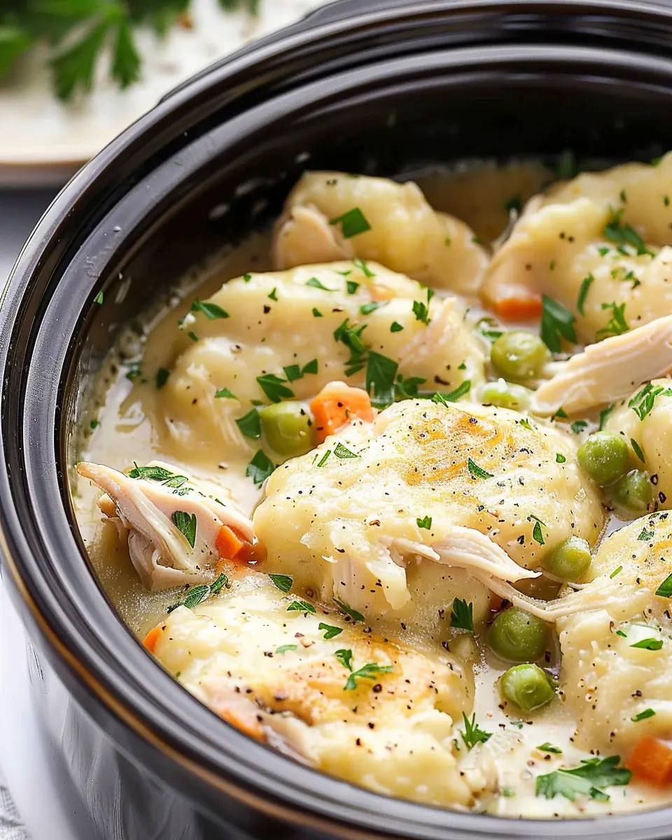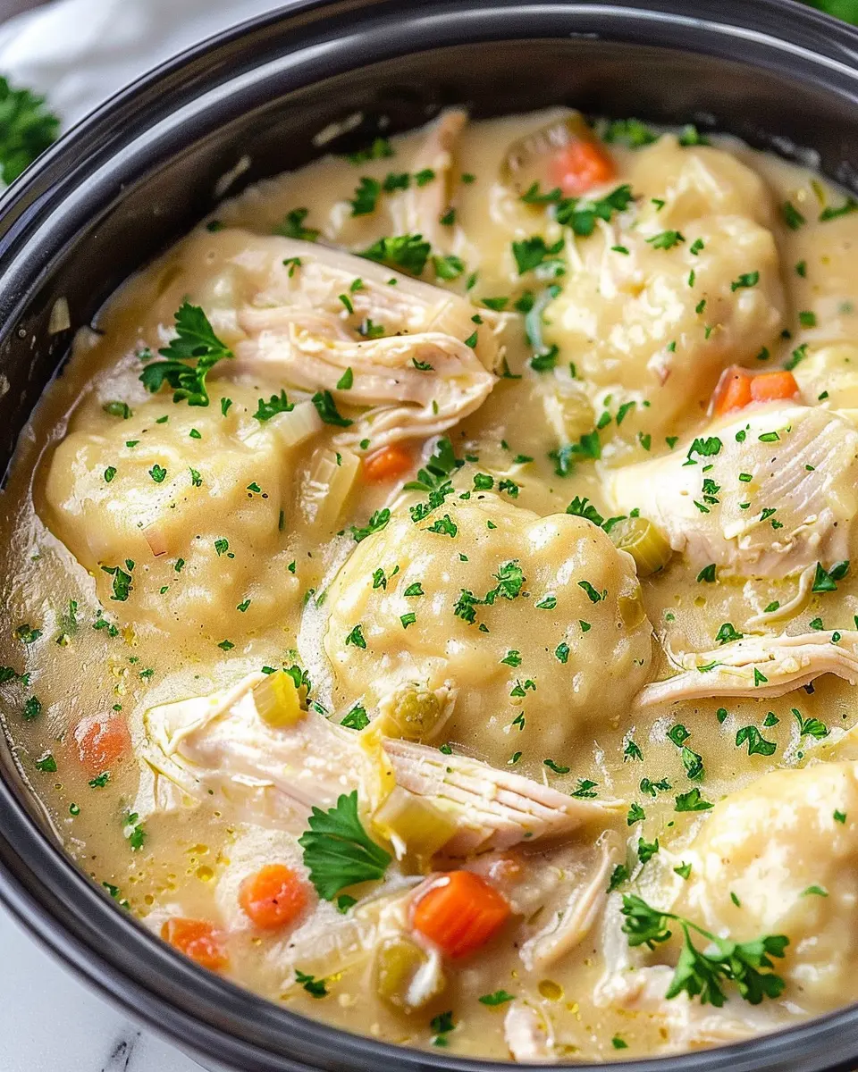 A delicious and easy recipe for chicken and dumplings made in a crockpot, perfect for family dinners.