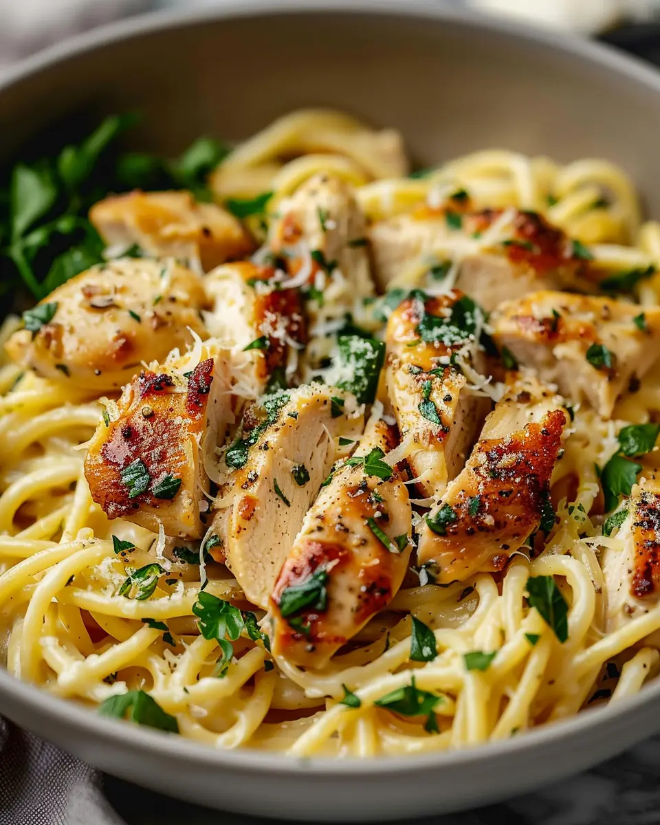 A flavorful and nourishing dish that combines tender chicken and wholesome pasta in a creamy garlic Parmesan sauce.