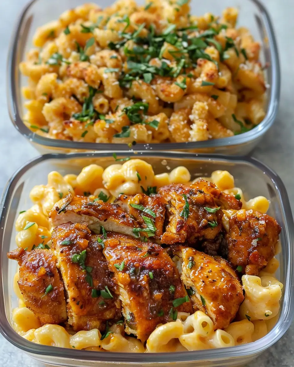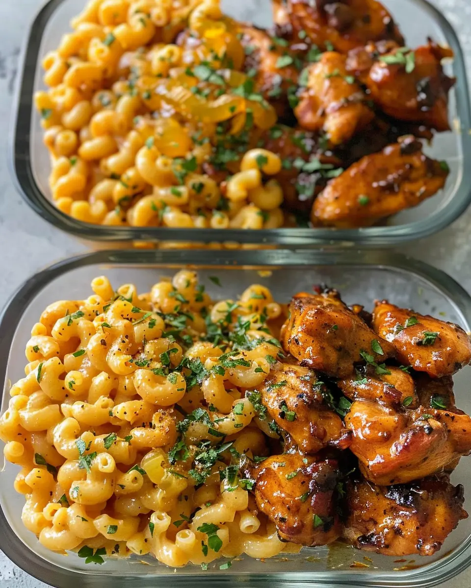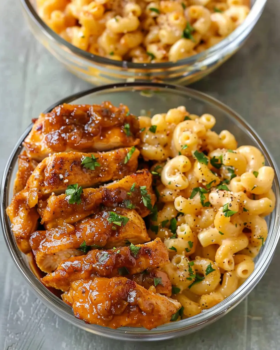 This high protein dish features succulent honey garlic butter chicken served with creamy mac and cheese, perfect for a hearty meal.