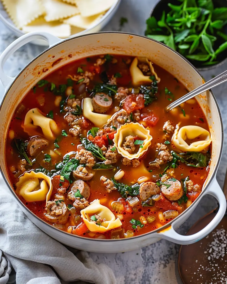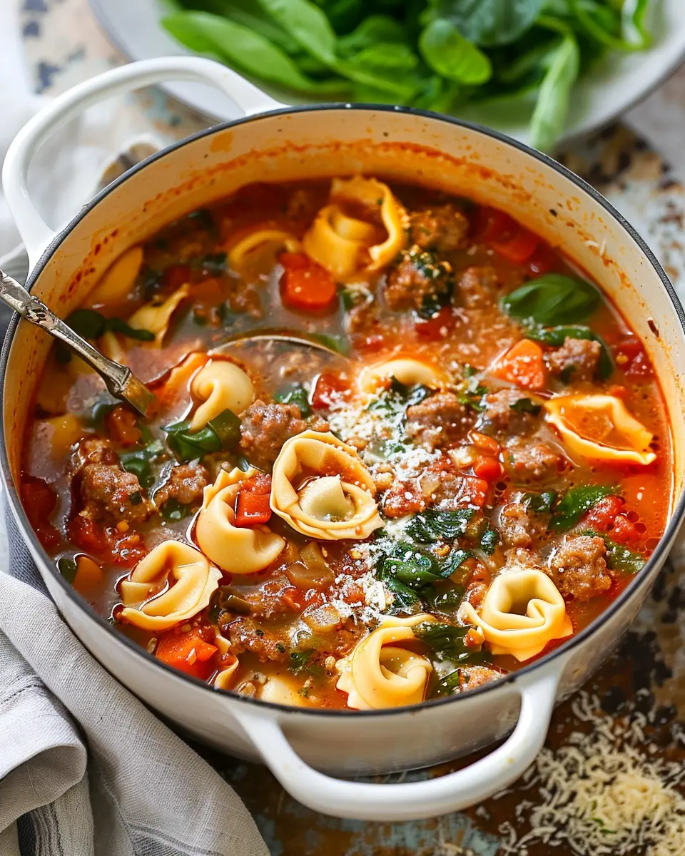 A warm and hearty soup perfect for chilly nights, featuring savory Italian sausage, tender tortellini, and rich broth.