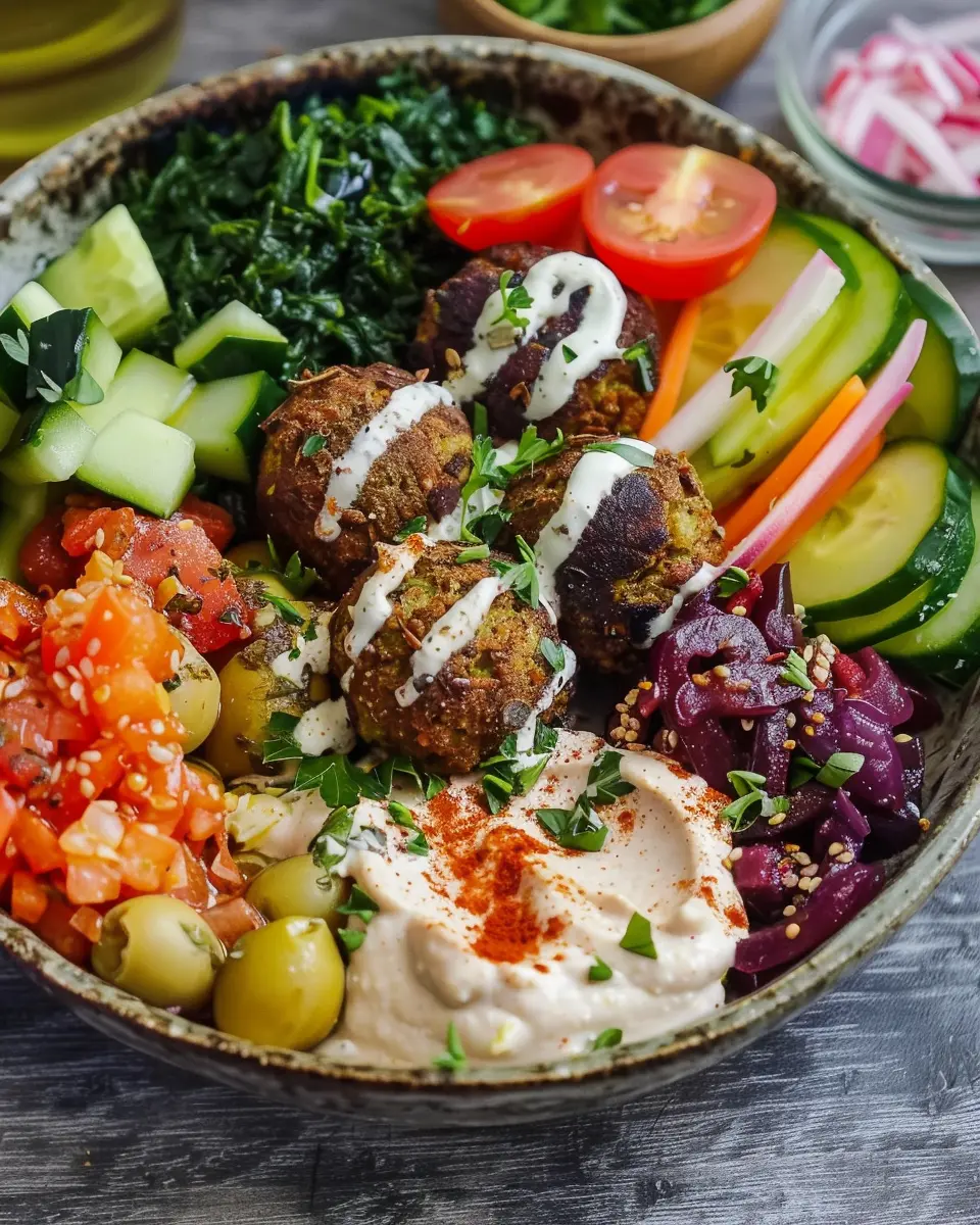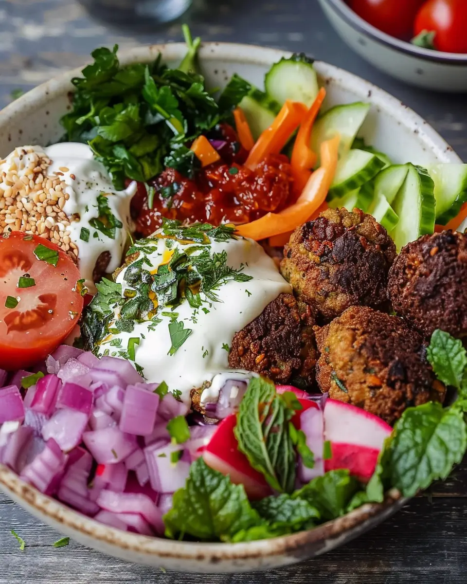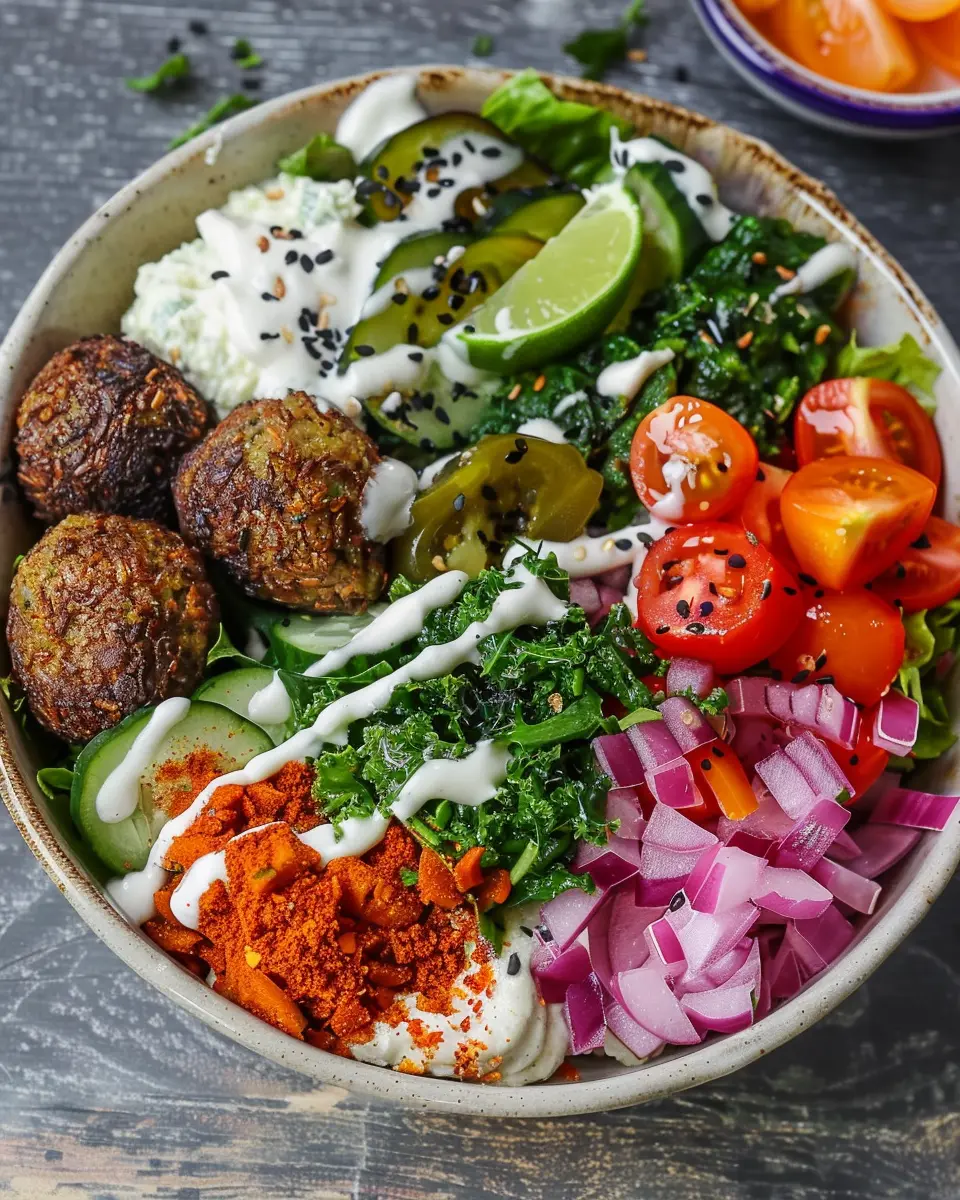 A delicious and nutritious falafel bowl loaded with fresh ingredients and vibrant flavors.