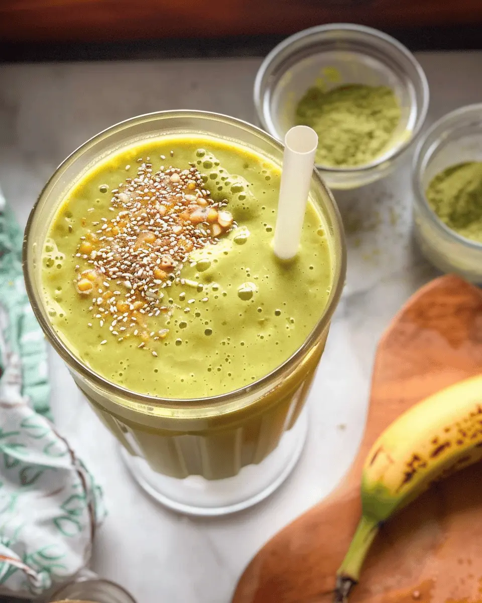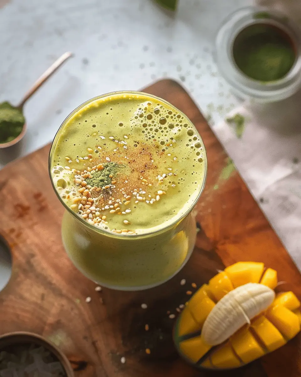A refreshing and energizing smoothie combining the flavors of mango, banana, and matcha, perfect for a quick pick-me-up.