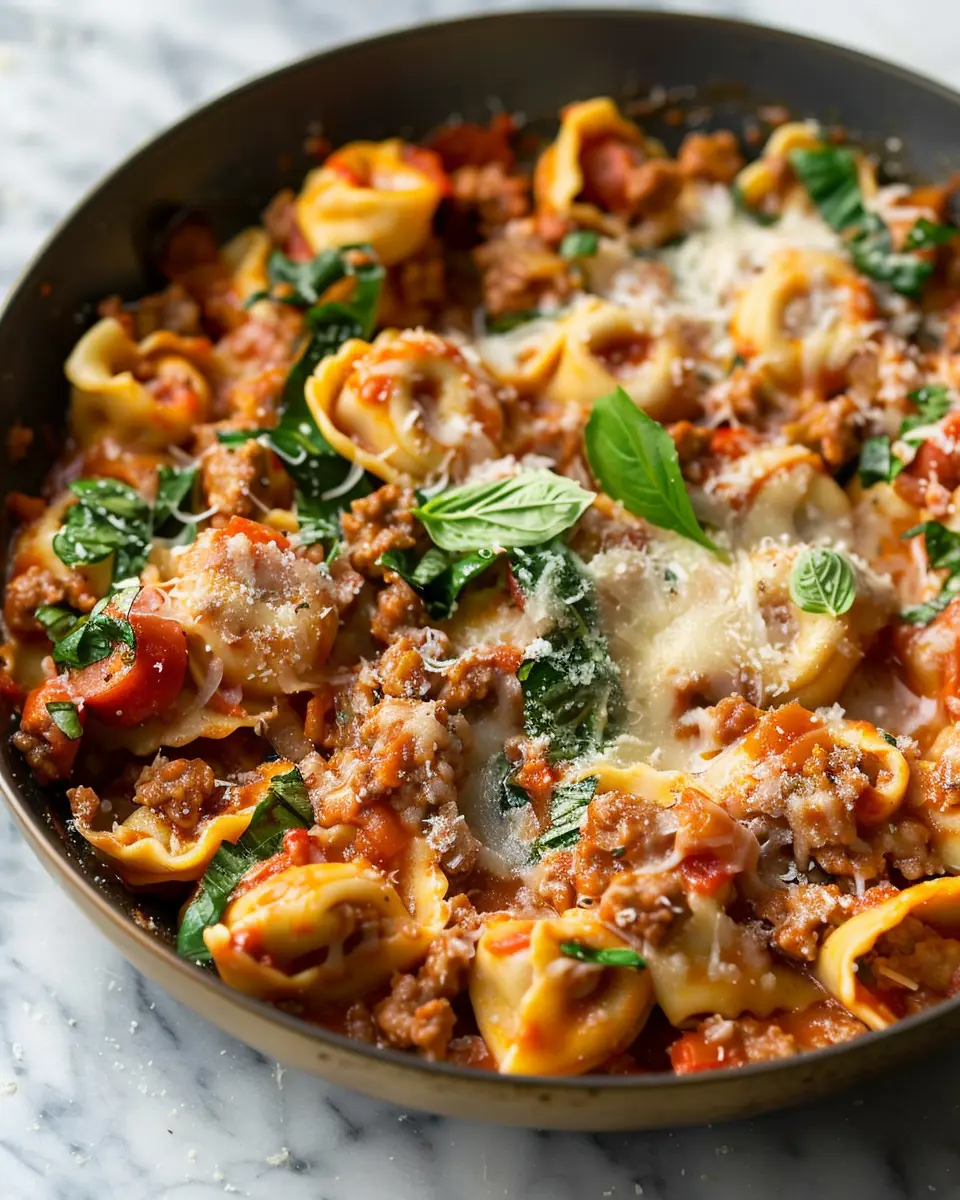A comforting and easy weeknight meal made with tortellini and sausage, all cooked in one pan for minimal cleanup.