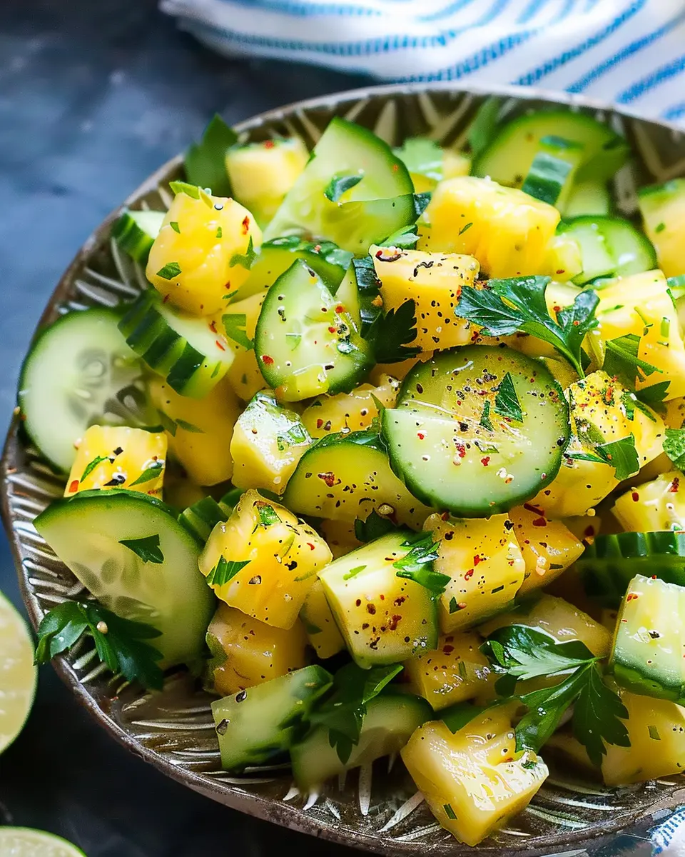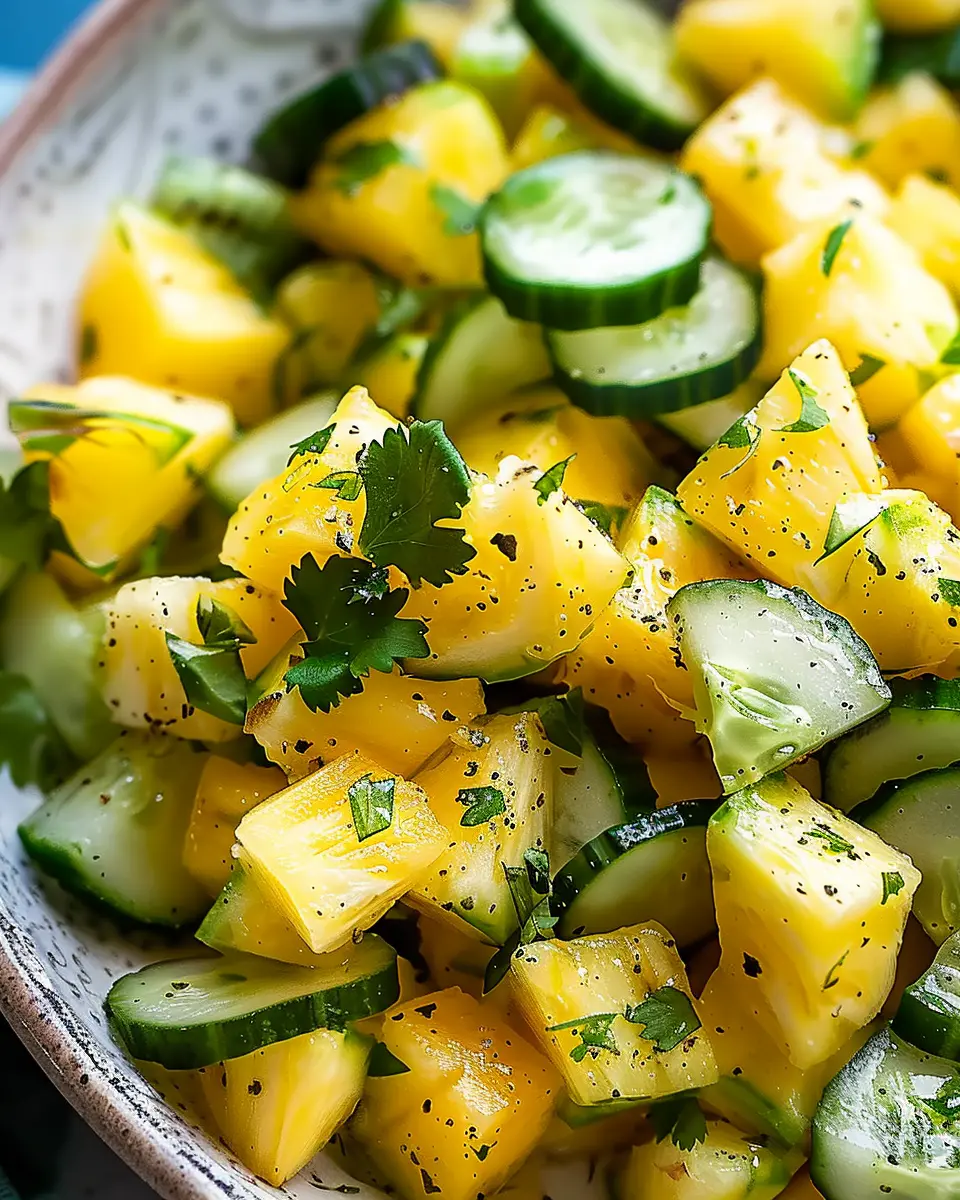 A vibrant and refreshing salad combining the sweetness of pineapple with the crispness of cucumber, perfect for complementing any meal.