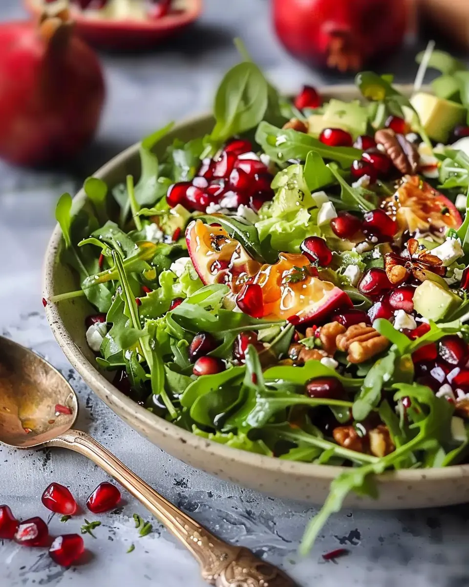 You’re now ready to enjoy your beautiful Pomegranate Christmas Salad! It’s perfect as a side dish for your holiday feast or as a light main course. Feel free to serve it immediately or refrigerate for later—just be mindful that the greens might wilt a bit if left too long.