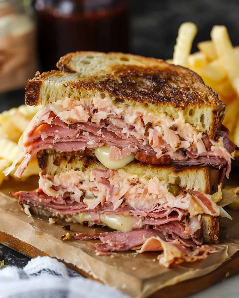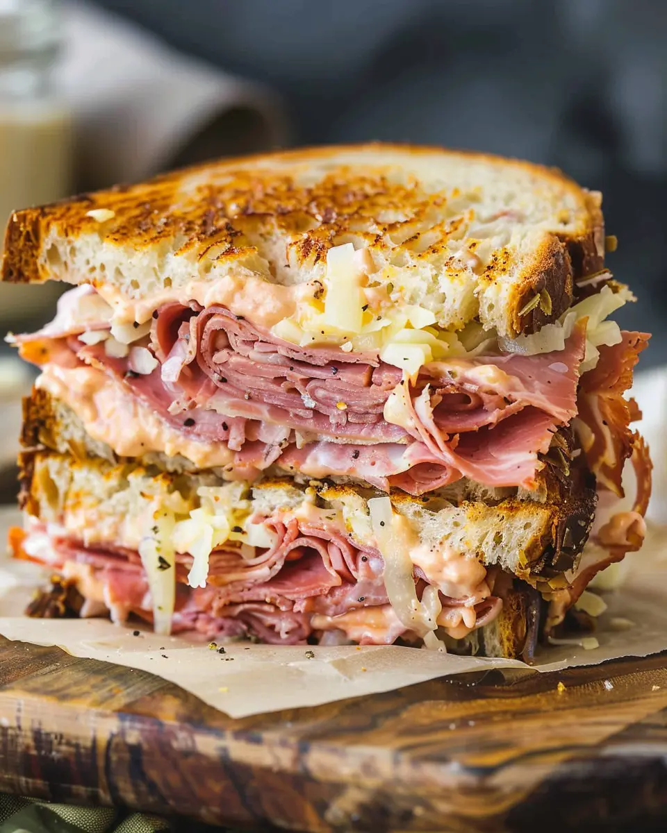 An indulgent take on the classic Reuben sandwich, featuring turkey bacon and chicken ham for a delicious twist.