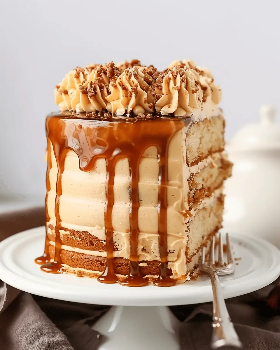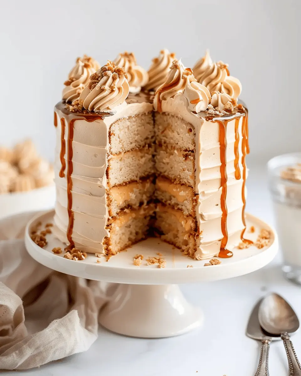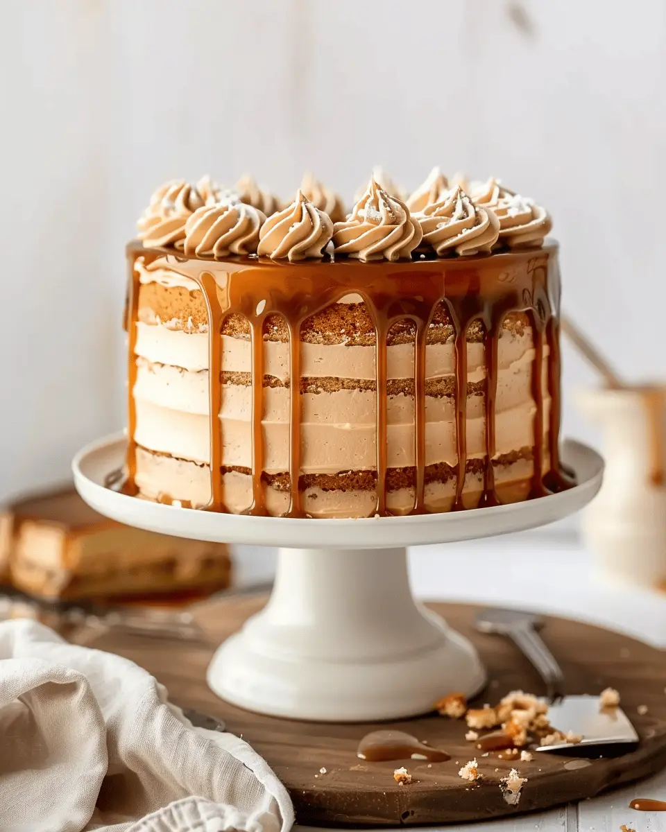 • Preparation: Place one cake layer on a serving plate. Spread a generous layer of buttercream on top, followed by a drizzle of salted caramel.
