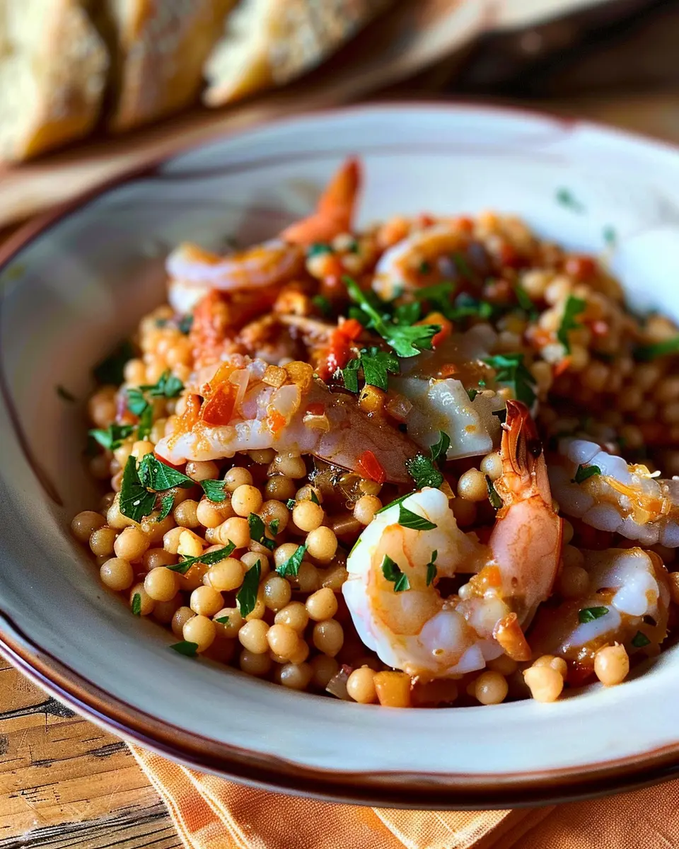 A delightful dish combining fregola with an array of seafood, offering a unique take on traditional flavors.