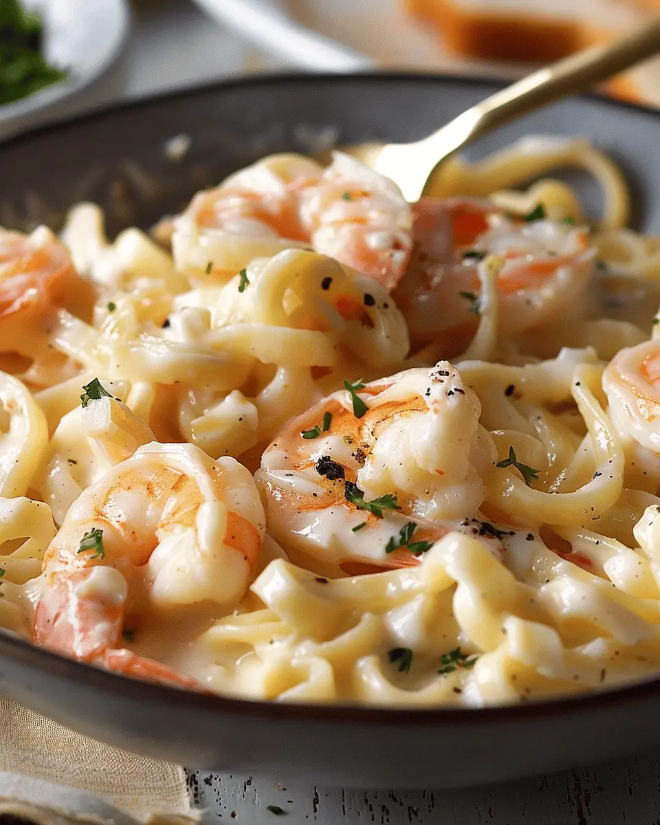 A rich and creamy Shrimp Alfredo featuring a twist of turkey bacon for added flavor.