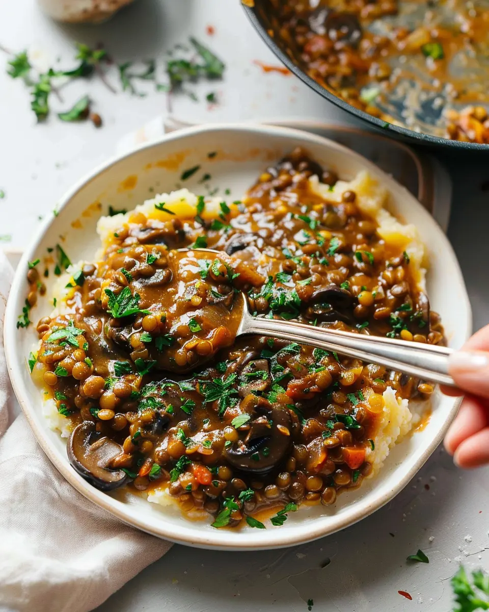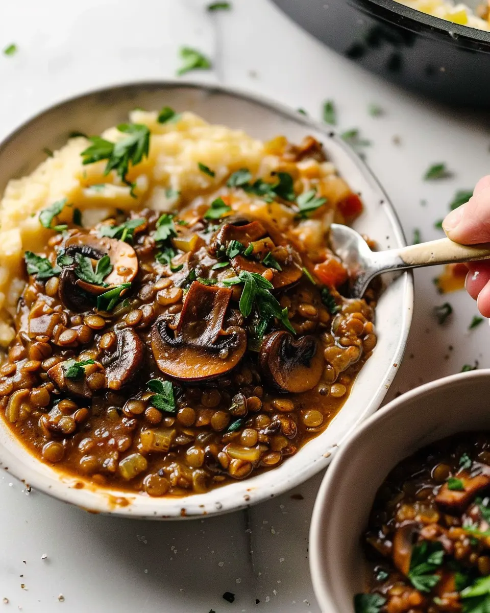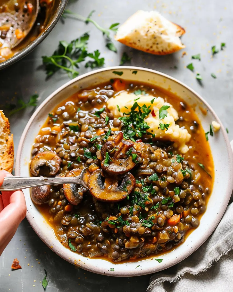 A delicious vegan stew loaded with lentils and mushrooms, perfect for a comforting meal.